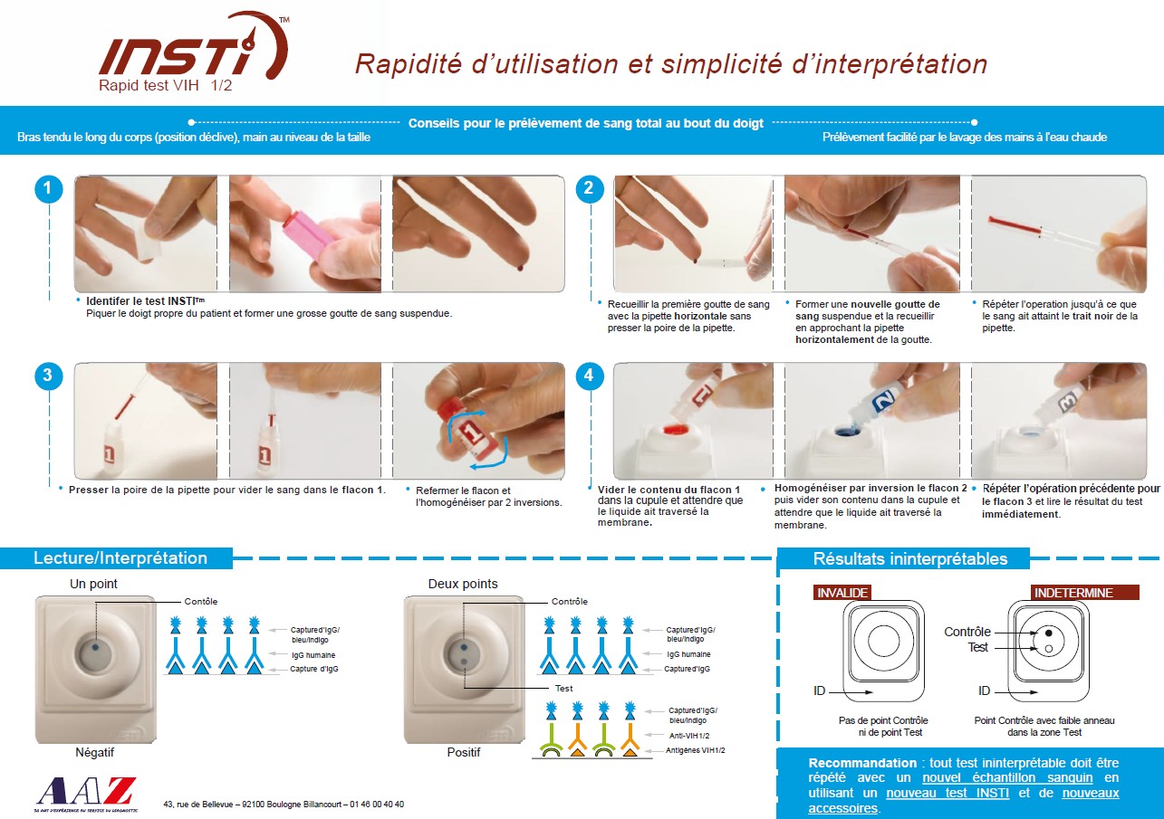 INSTI VIH® est un test immunologique de détection des anticorps du VIH-1/VIH-2 à usage unique à l’aide d’une goutte de sang prélevée par piqûre au bout du doigt.