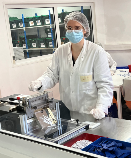 Cette filière œuvre chaque jour à la production, l’assemblage et le conditionnement de nos tests et autotests dans des ateliers certifiés ISO 13485, équipés de salles blanches ISO 8 et 9.